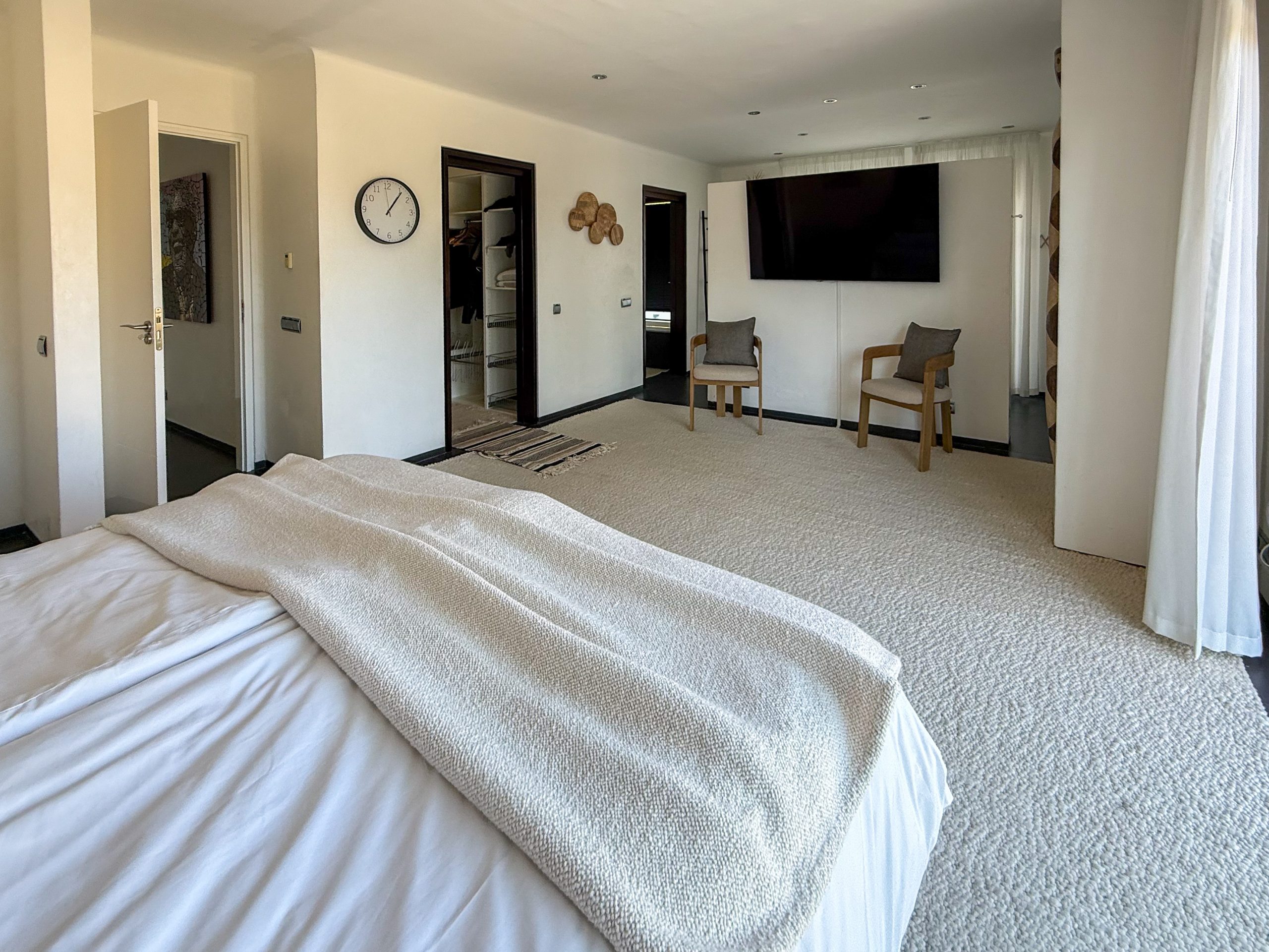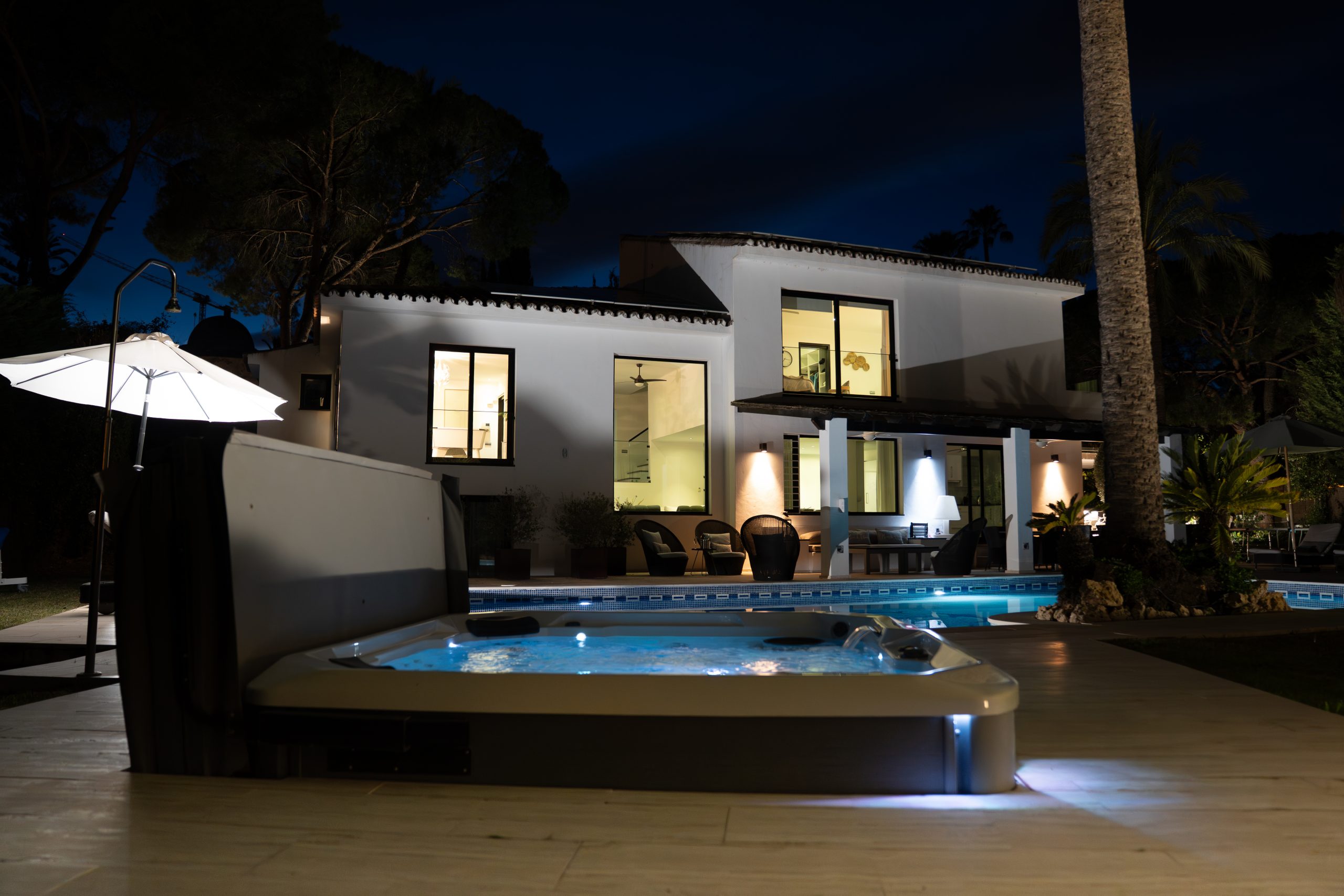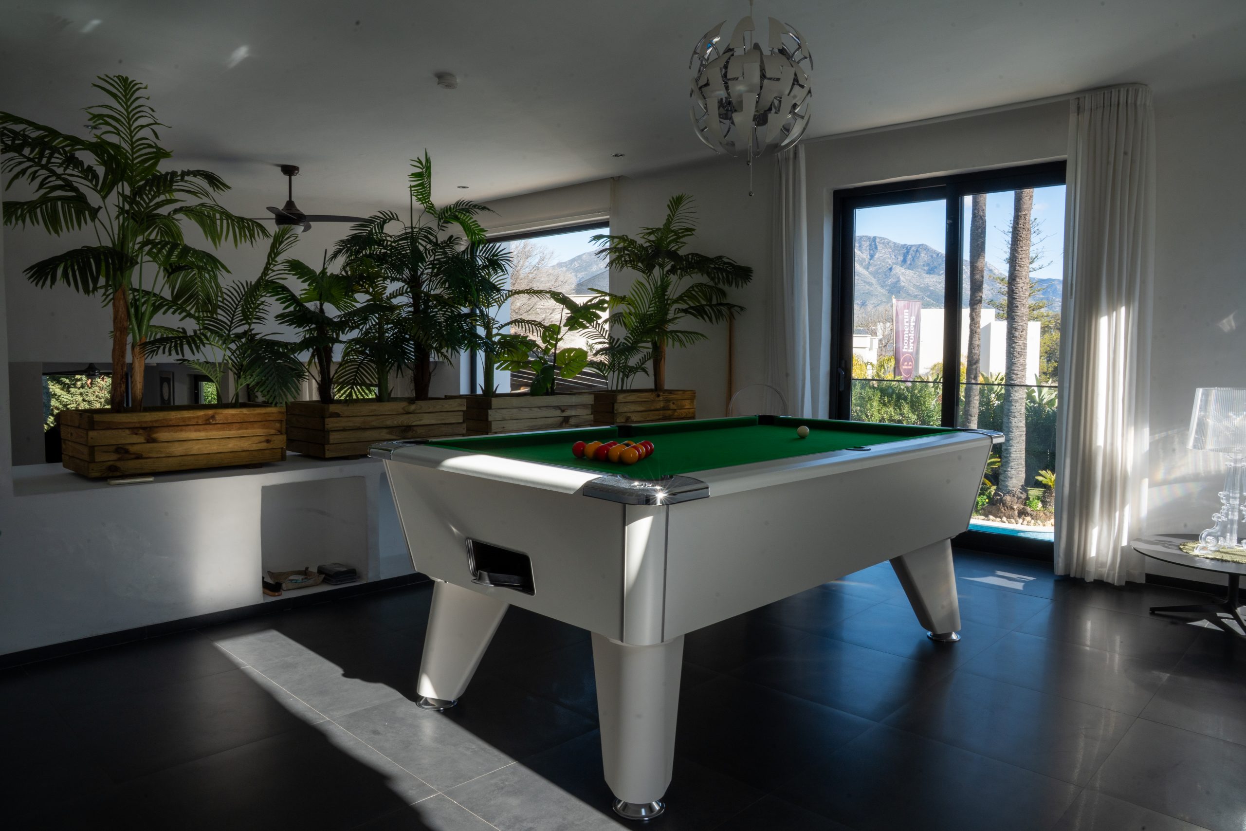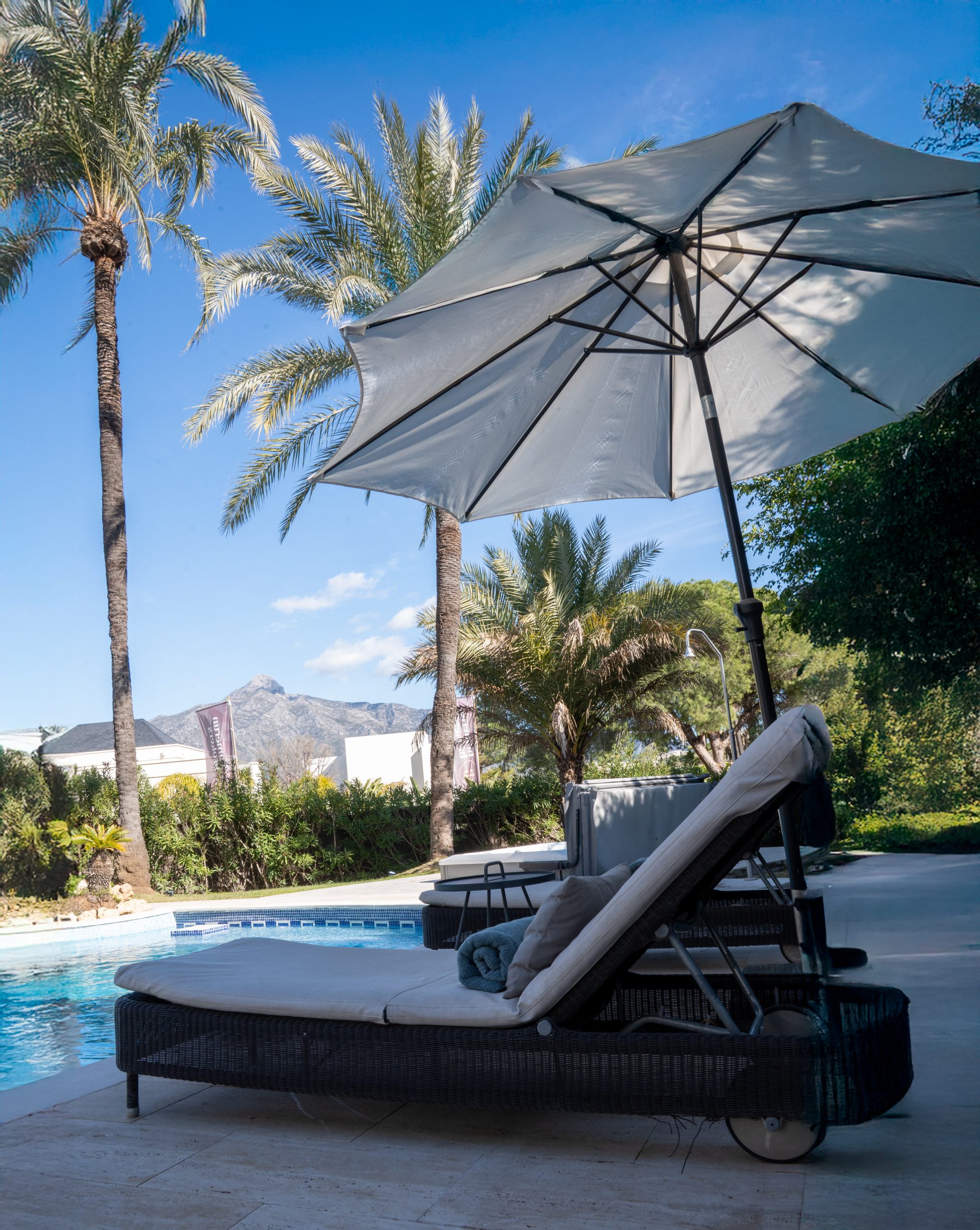 Outside you have a spacious garden with palm trees, a large heated swimming pool and jacuzzi. The barbecue area is ideal for entertaining and dining under the stars, while the partly covered terrace and lounge seating offer a cosy feel. With total privacy and views towards the mountains, it is genuinely a peaceful haven of paradise.